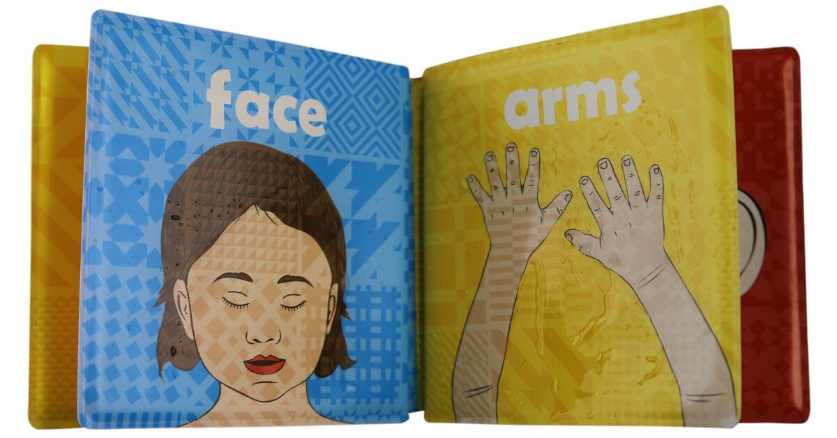 مياه الاستحمام الموحلة بعد أن يلعب طفلك النشط في الفناء؟ لا تقلق. كتب الحمام المقاومة للماء سهلة التنظيف للغاية. فقط بضع مناديل سريعة بالماء العادي وستكون مشرقة ونظيفة. اترك الكتاب مفتوحًا ، وقم بتفريغ الصفحات حتى تجف وشاهد الرسوم التوضيحية الملونة تتحول إلى اللون الأبيض مرة أخرى. لا حاجة لاستخدام أي مواد كيميائية أو صابون ضار للحفاظ على كتاب حمام “My First Wudu Book” نظيفًا وآمنًا ليستمتع به طفلك مرارًا وتكرارًا.