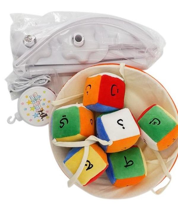 سرير أطفال إسلامي – مكعبات الأبجدية العربية تعلق بسرير الأطفال وتتميز بعلبة موسيقية حديثة تعزف عليها التهويدات الإسلامية والقرآن.
