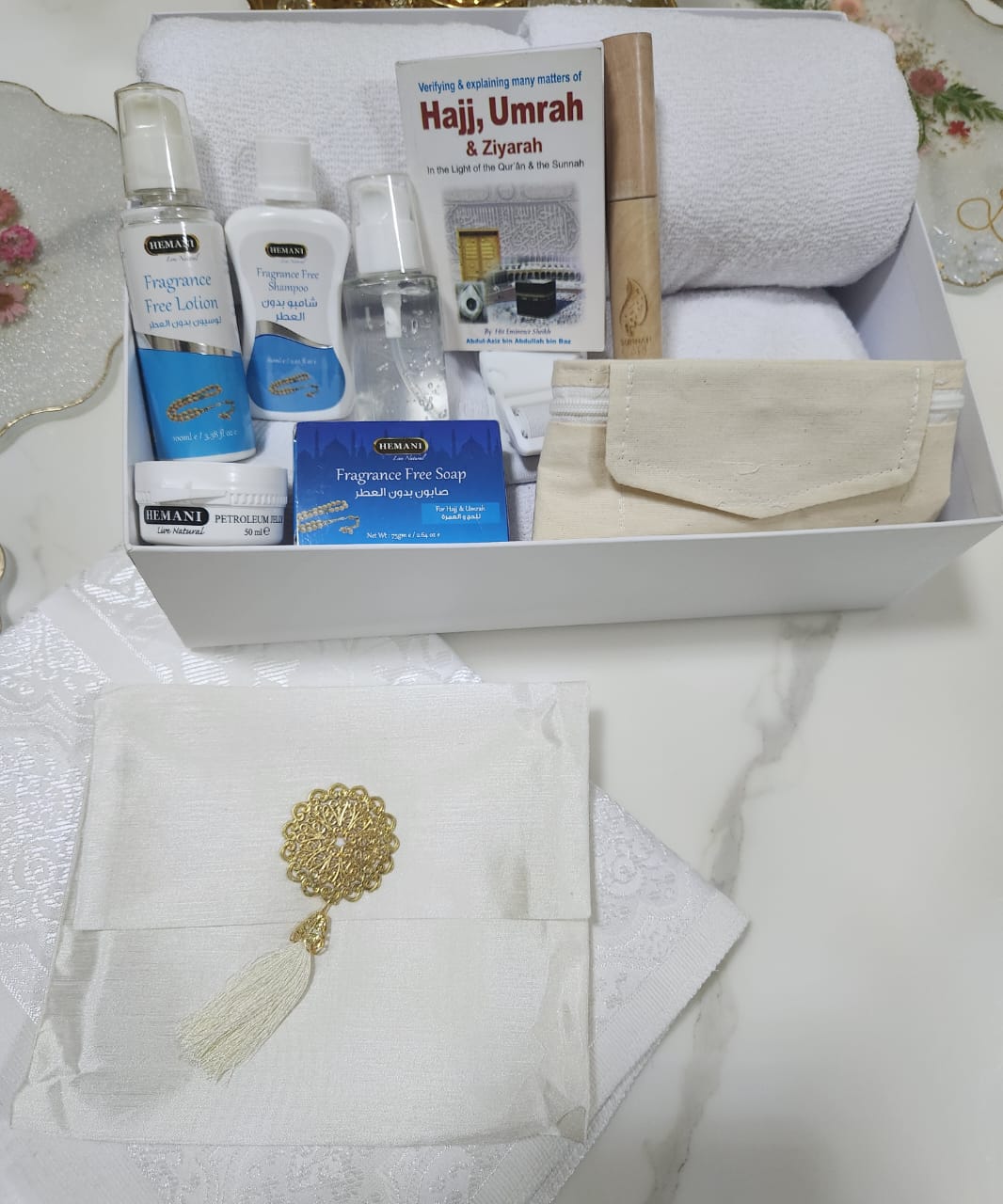 - مجموعة واحدة تتضمن مجموعة من فوط الإحرام (مما يعني وجود منشفتين في الصندوق). لذلك يمكن استخدام هذه المجموعة لشخص واحد.