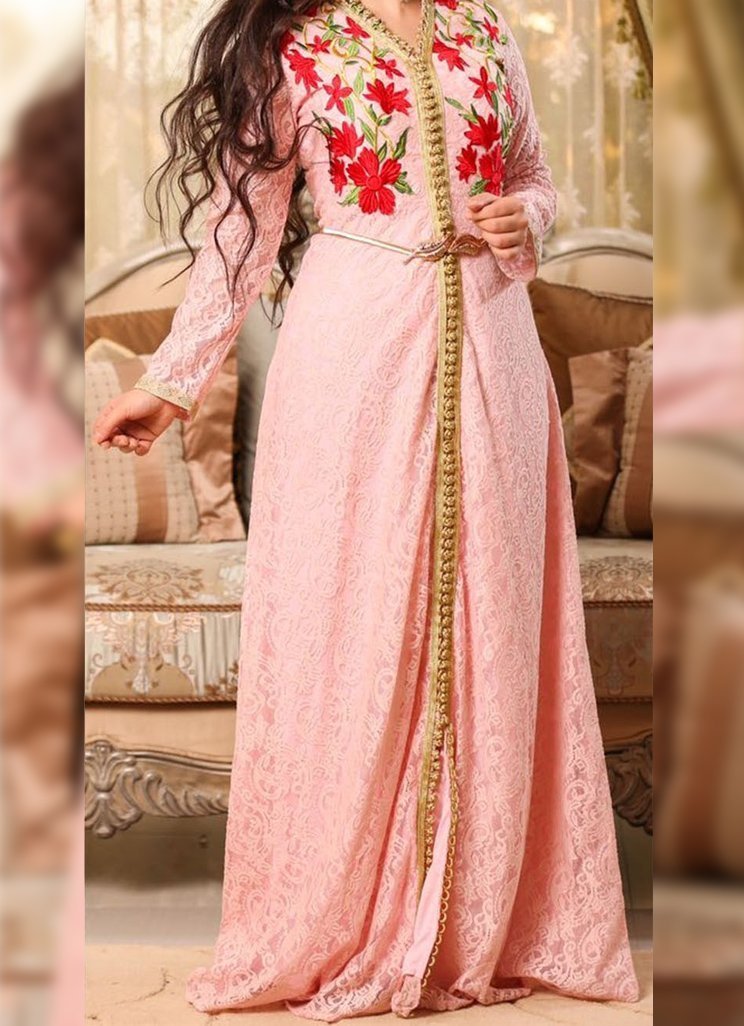 جلابية شبكية باللون الوردي الداكن مع تطعيمات الورد الأحمر تجعلها لباس رسمي متلألئ.