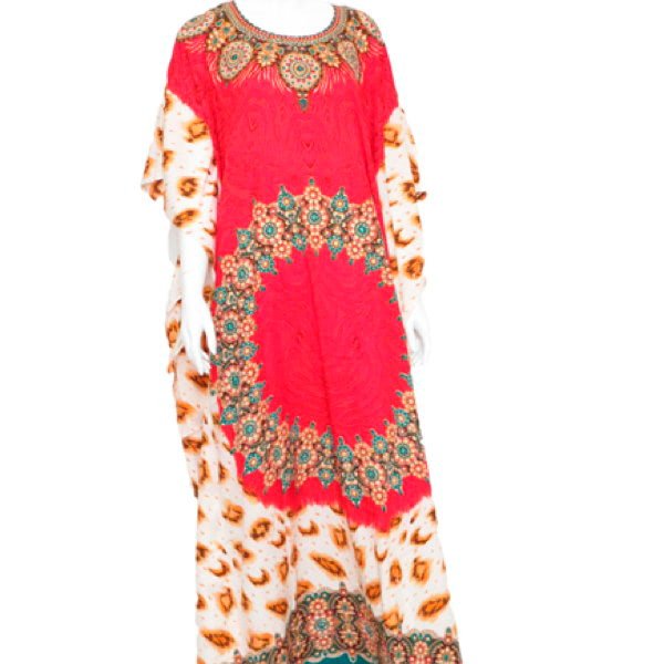قفطان لامع وجريء بتصميم مطبوع جميل وزخارف صغيرة.