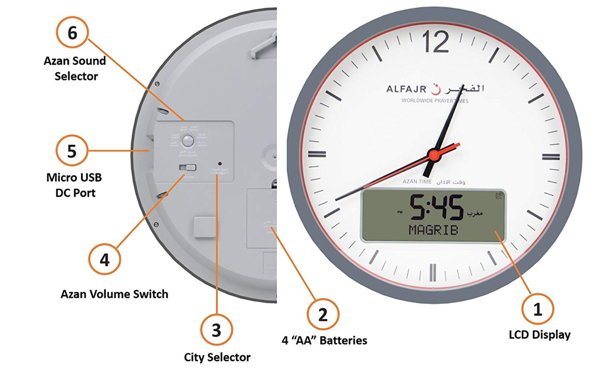Digital and Analog Azan ClockFive High quality Azan sounds (Makkah, Madinah, Quds, Egypt, Riyadh)Temperature display (External or Internal)Size 13.5 by 13.5 by 3 InchesEasily Mount on WallExternal speakers jackSize: 33 X 33 X 5 cm
