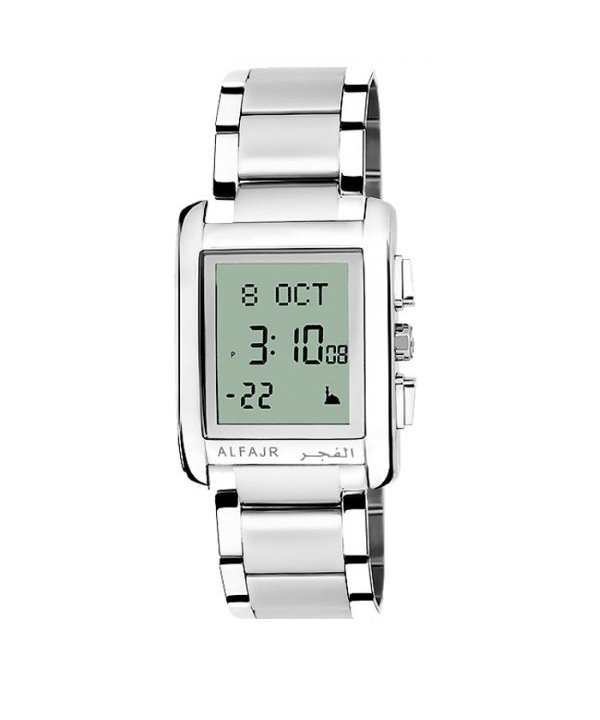 Classic stainless steel wristwatch with a rectangular polished case and a bracelet of stainless steel with triple folding clasps. The glass is scratch resistant and the Crystal FSTN LCD has Blue back light. This has also has many other features like Qibla direction, Quran bookmark, Azan times and much more.