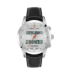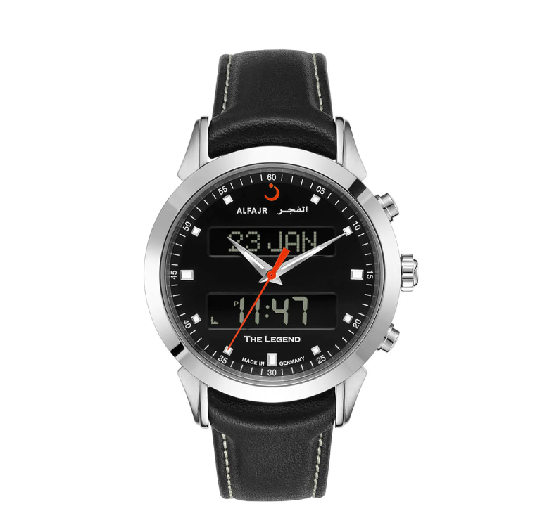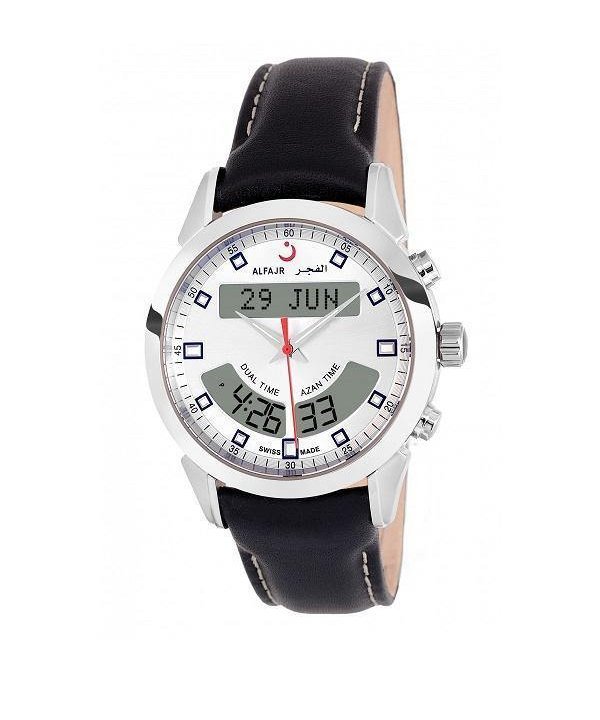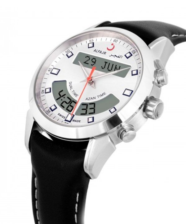 This is the newest Swiss-made model of AL-FAJR with a dual-time display (Analog/Digital). The watch is made with a round Stainless Steel polished case and a black Leather strap. Scratch-resistant glass and Water-Resistant watch with a five-year warranty. Case size 40 mm. Also, it has a Crystal FSTN LCD with a blue EL Back Light.