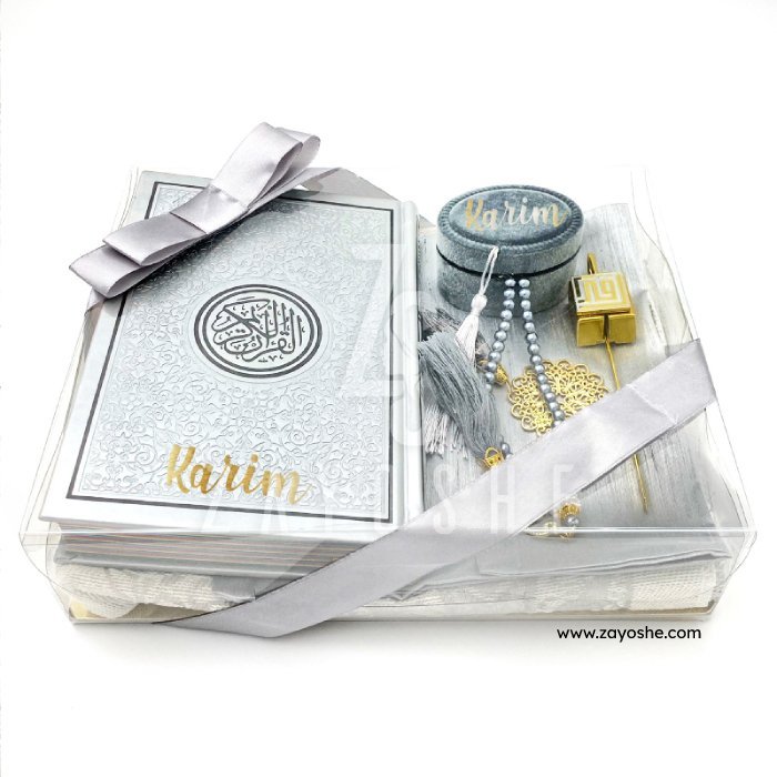 Personalize each item with your name to create a truly unique and meaningful gift that will be cherished for a lifetime! Our Premium Personalized Islamic Gift Set in Silver color is designed to spread joy and blessings worldwide.