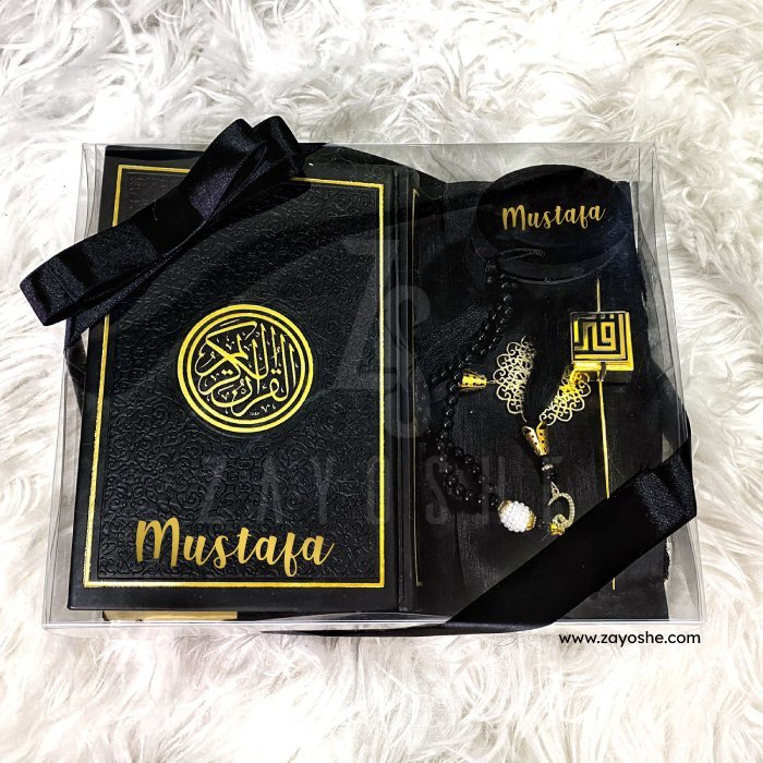 Elevate your gift-giving experience with our elegant and beautiful black premium personalized Islamic gift set, meticulously curated for special occasions such as Ramadan, Eid, weddings, housewarmings, or as a heartfelt gesture for new Muslims embracing their faith.
