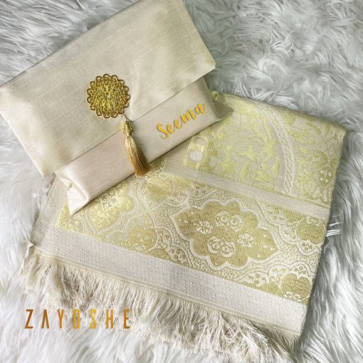 Transform your prayer moments into a luxurious and spiritually uplifting experience with our silk gold prayer rug with pouch in Saudi Arabia from Zayoshe. Order yours today and embrace the beauty of devotion in every prayer.