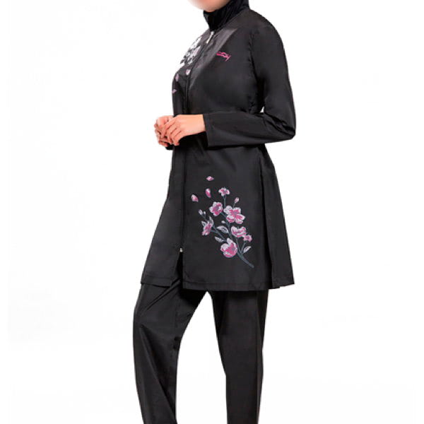 A modest black swimwear having details of purple flower designed with the purpose of providing women with full coverage swimming gear to enjoy swimming.High-quality swimsuit fabric,front zip style, Chlorine resistant, Light weighted,Full sleeves.