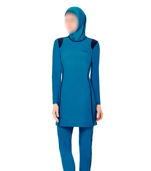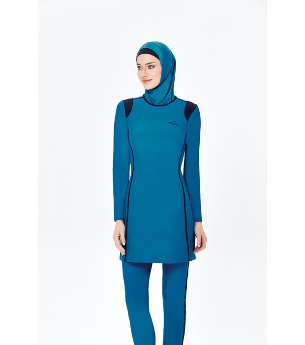 A sporty blue modest swimwear designed with the purpose of providing women with full coverage swimming gear to enjoy swimming.