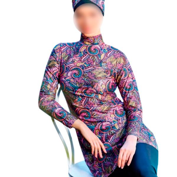 A vibrant modest swimwear having grey leggings, designed with the purpose of providing women with full coverage swimming gear to enjoy swimming.High-quality swimsuit fabric, Chlorine resistant, Light weighted,Full sleeves.