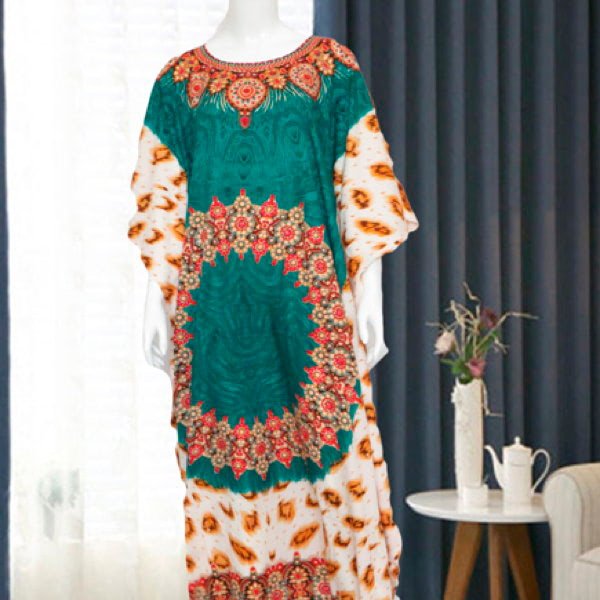 Bright and Bold Kaftan with beautiful printed design and small embellishments.
